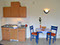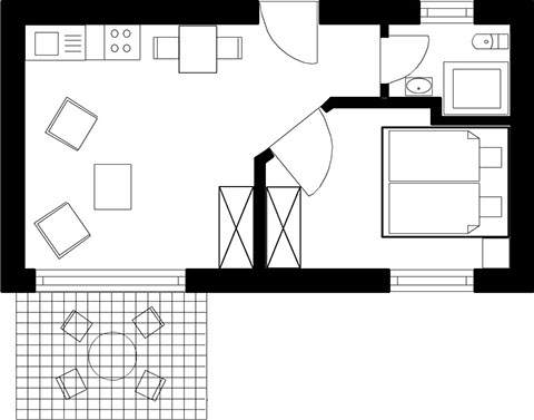 Gemütlich eingerichteter Wohnraum mit Kochnische, Ess- und Sitzecke und mit einer Tür zu einer möblierten Terrasse zum